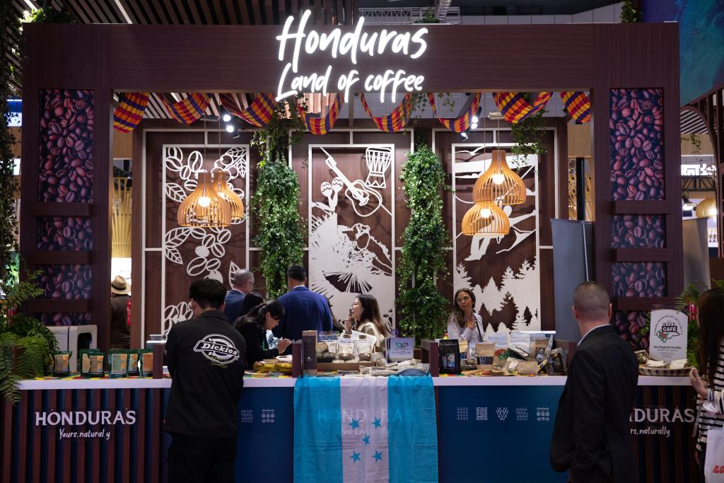 Visitors learn about coffee beans at the booth of Honduras at the 6th China International Import Expo (CIIE) in east China's Shanghai, Nov. 6, 2023. (Xinhua/Jin Liwang)