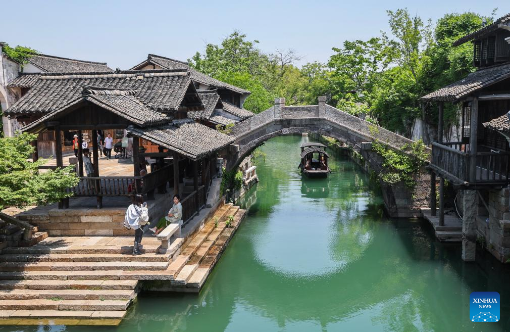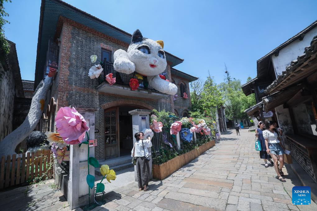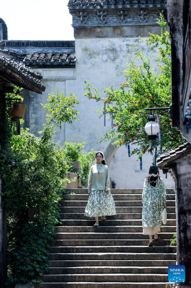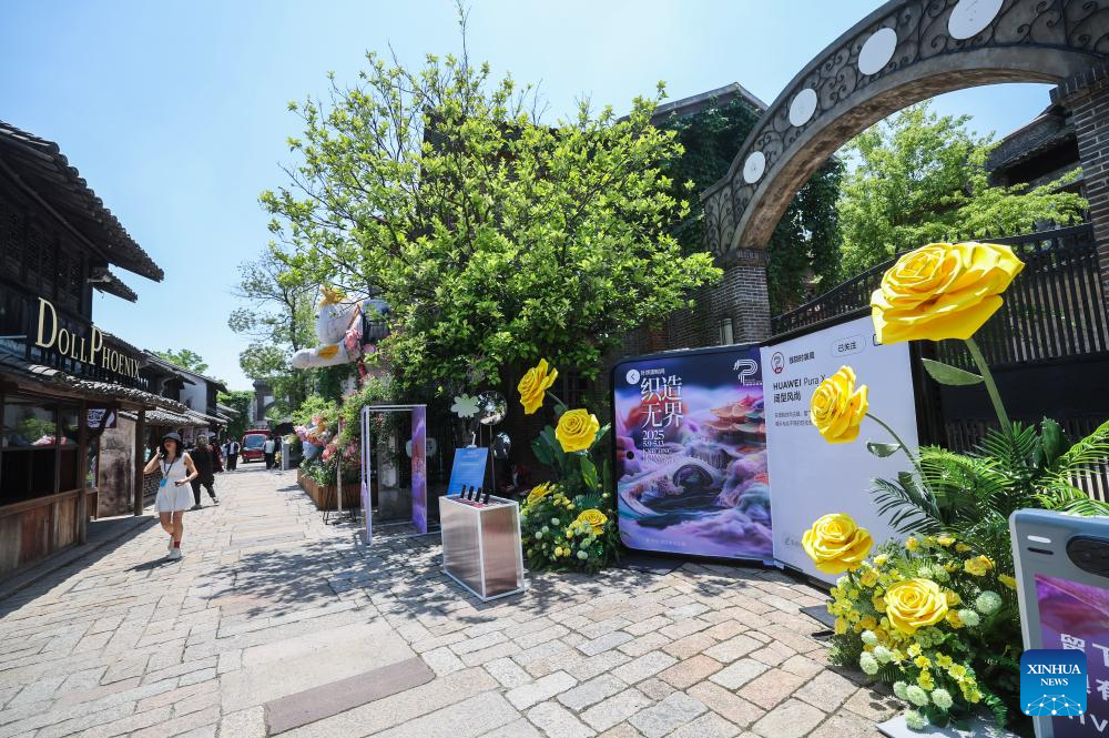 Tourists visit the Puyuan Fashion Resort in Puyuan Town of Tongxiang City of Jiaxing, east China's Zhejiang Province, May 12, 2025. The 2025 Puyuan Fashion Week has launched recently at Puyuan Fashion Resort in Jiaxing, embracing the theme "Knitting Beyond Boundaries."