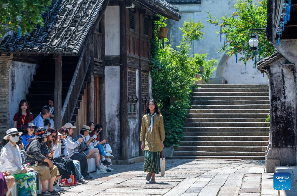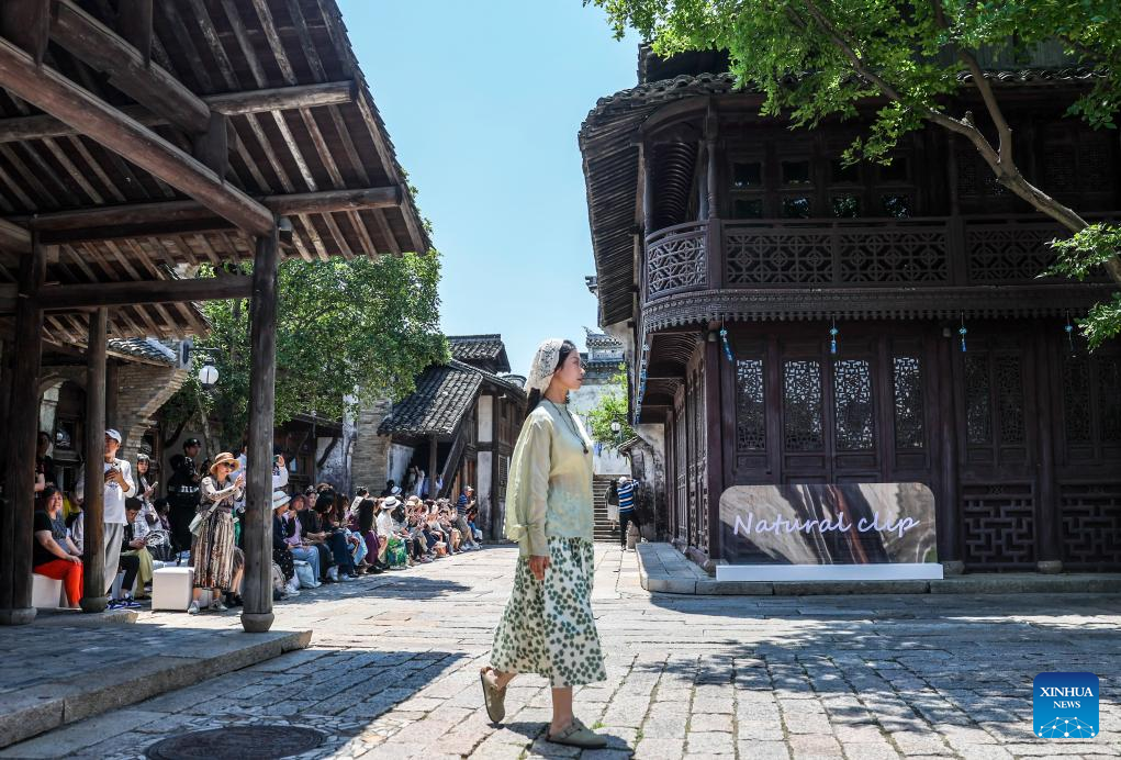Models present creations during the 2025 Puyuan Fashion Week at the Puyuan Fashion Resort in Puyuan Town of Tongxiang City of Jiaxing, east China's Zhejiang Province, May 12, 2025. The 2025 Puyuan Fashion Week has launched recently at Puyuan Fashion Resort in Jiaxing, embracing the theme "Knitting Beyond Boundaries."