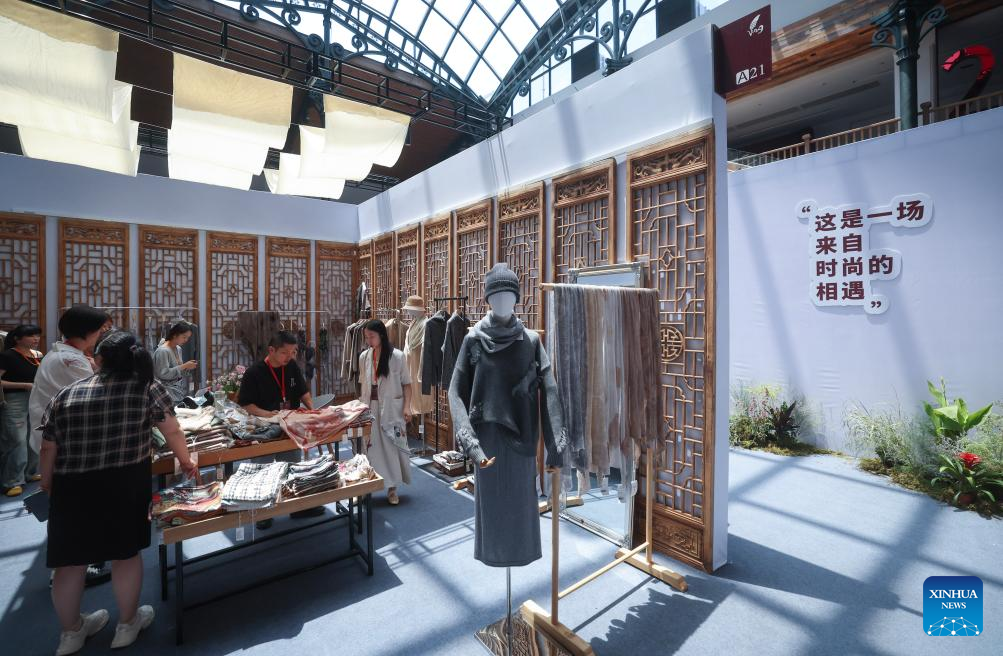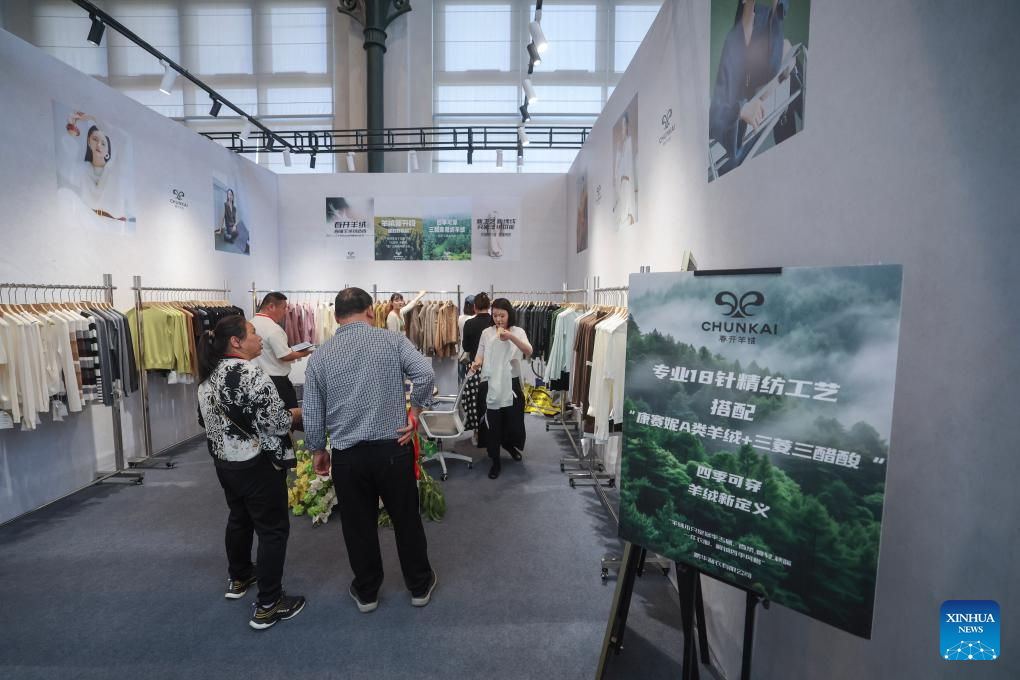 A trade fair is held during the 2025 Puyuan Fashion Week at the Puyuan Fashion Resort in Puyuan Town of Tongxiang City of Jiaxing, east China's Zhejiang Province, May 12, 2025. The 2025 Puyuan Fashion Week has launched recently at Puyuan Fashion Resort in Jiaxing, embracing the theme "Knitting Beyond Boundaries."