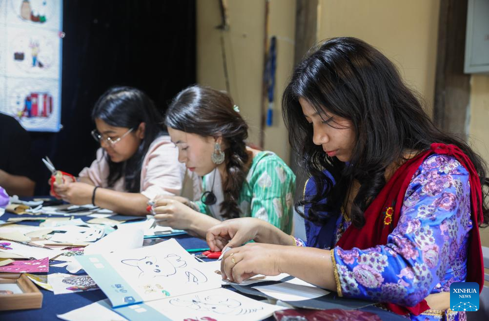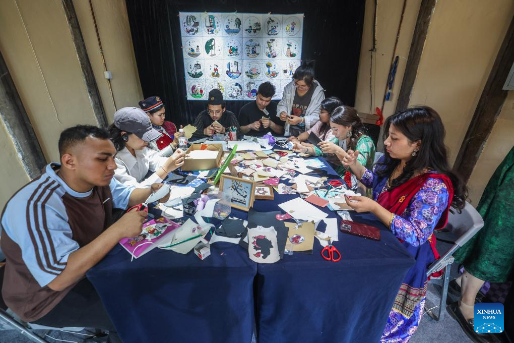 Foreign visitors experience fabric collage at the Puyuan Fashion Resort in Puyuan Town of Tongxiang City of Jiaxing, east China's Zhejiang Province, May 12, 2025. The 2025 Puyuan Fashion Week has launched recently at Puyuan Fashion Resort in Jiaxing, embracing the theme "Knitting Beyond Boundaries."
