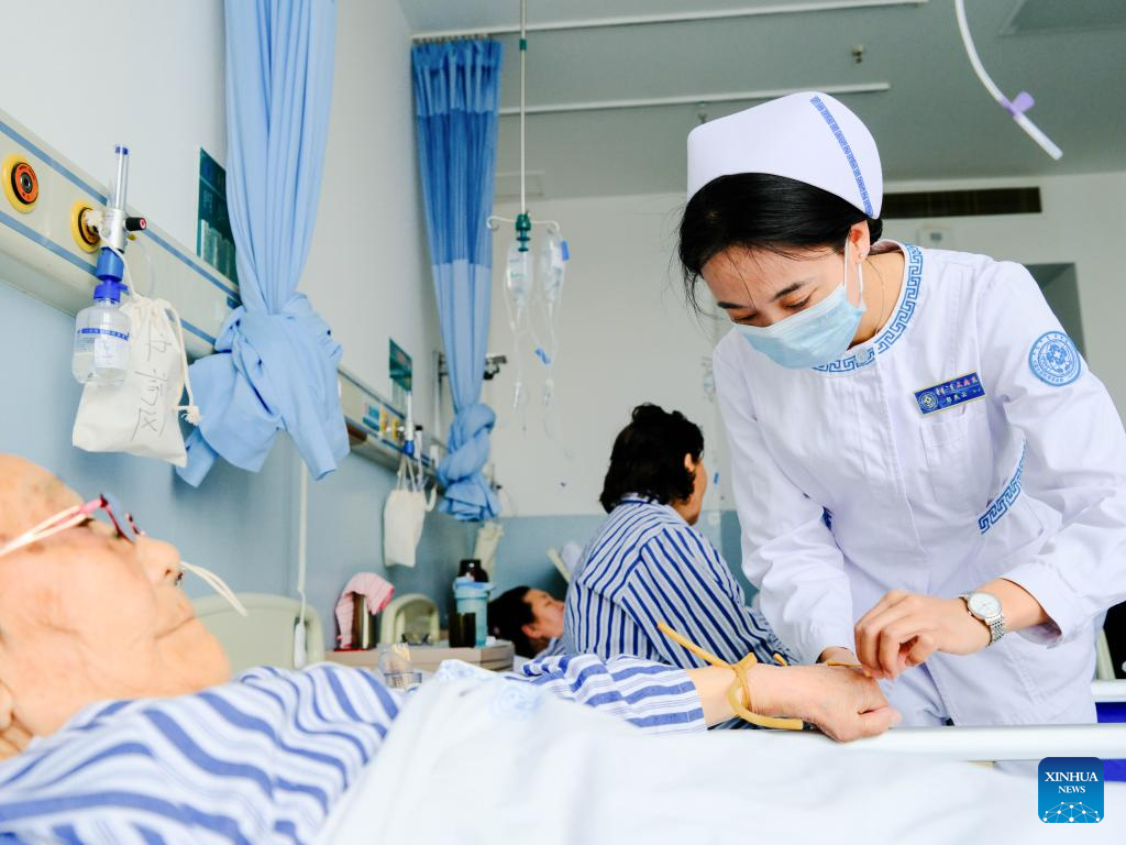 A nurse applies an intravenous drip to a patient at the International Mongolian Hospital of Inner Mongolia in Hohhot, north China's Inner Mongolia Autonomous Region, May 12, 2025. The nurses of the hospital were busy at their posts on the International Nurse Day. By combining traditional Mongolian medical practices such as tea, wine and moxibustion with contemporary nursing methods, they offer patients nursing services that embodies ethnic medicine characteristics. (Xinhua/Ma Jinrui)