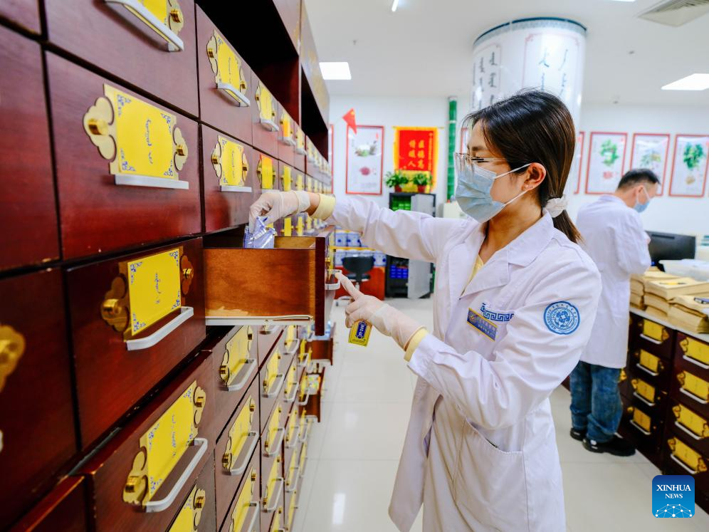A pharmacist dispenses medicine at the Mongolian medicine room of the International Mongolian Hospital of Inner Mongolia in Hohhot, north China's Inner Mongolia Autonomous Region, May 12, 2025. The nurses of the hospital were busy at their posts on the International Nurse Day. By combining traditional Mongolian medical practices such as tea, wine and moxibustion with contemporary nursing methods, they offer patients nursing services that embodies ethnic medicine characteristics. (Xinhua/Ma Jinrui)