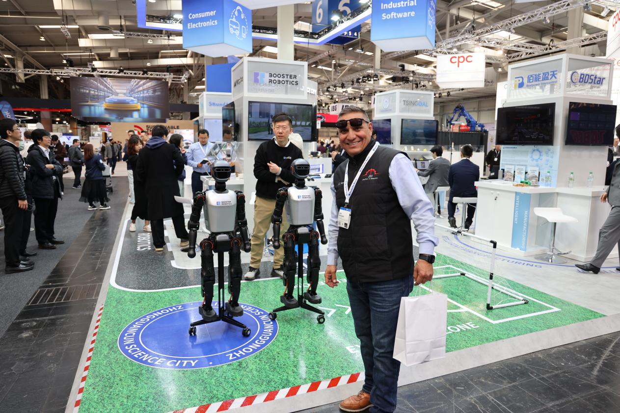 A man poses for a picture in front of humanoid robots manufactured by a Chinese company at the Hannover Messe 2025, one of the world's premier industrial trade fairs, dedicated to the topic of industry development. (Photo by Liu Zhonghua/People's Daily)