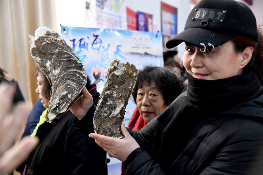 A visitor holding an oyster poses for photos at an oyster gala held in Rushan City, east China's Shandong Province, Jan. 11, 2020. (Xinhua/Guo Xulei)