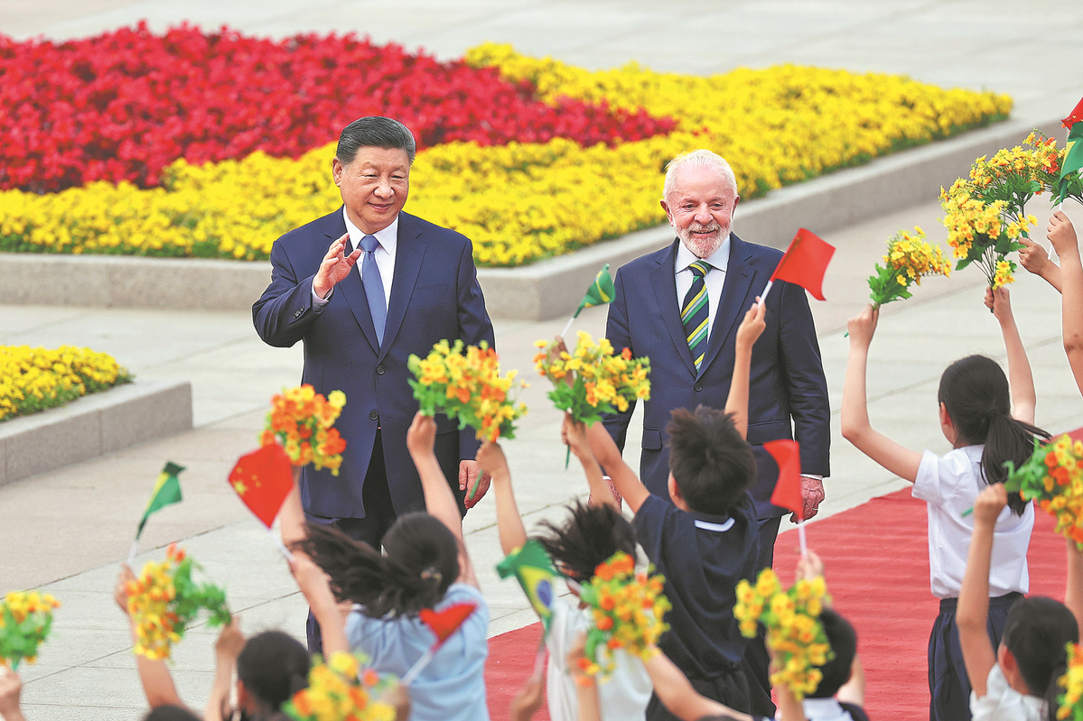 President Xi Jinping holds a welcoming ceremony for Brazilian President Luiz Inacio Lula da Silva in Beijing on Tuesday. (Wang Zhuangfei/China Daily)