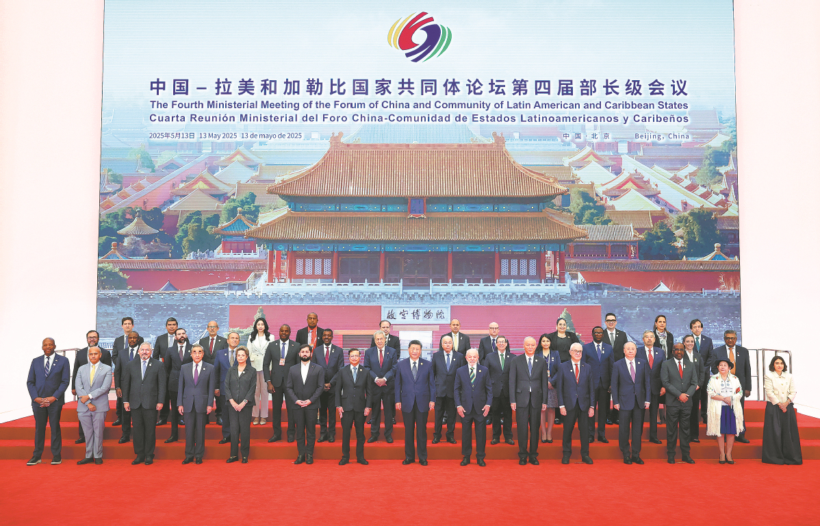 President Xi Jinping (front, center) and other participants pose for a group photo at the opening ceremony of the fourth ministerial meeting of the China-Community of Latin American and Caribbean States Forum in Beijing on Tuesday. (Ding Haitao/Xinhua)