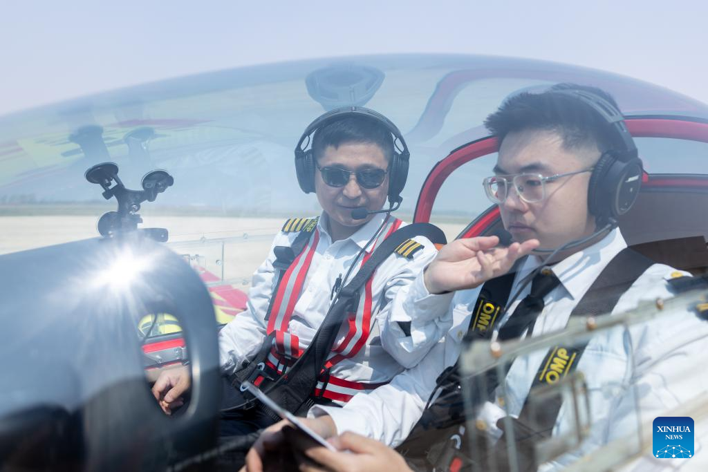 A trainee (R) attends a light sport aircraft flight training session at Liaoning Zhongzhi Yisheng Aviation Flight Academy in Faku County, in Shenyang, northeast China's Liaoning Province, April 26, 2025. As an important driving force of new economic momentum, the low-altitude economy is viewed by many as a key strategic emerging industry.