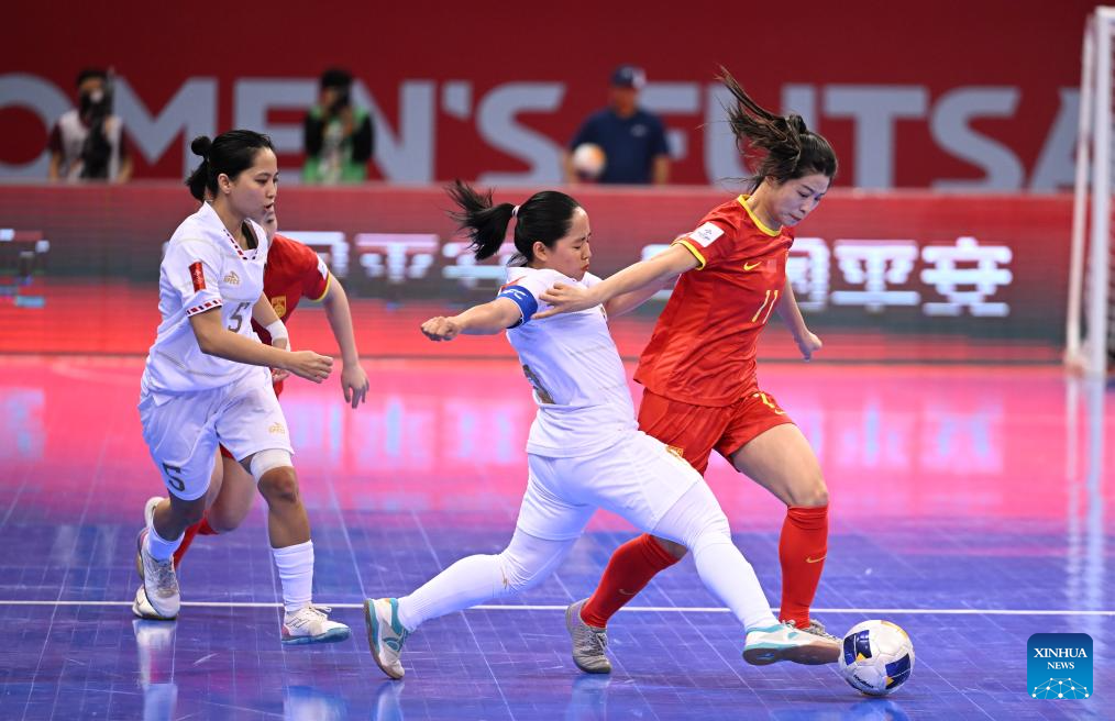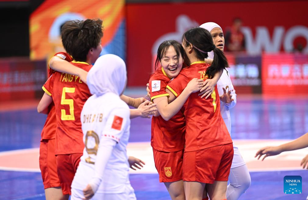 Players of China celebrate a goal during the quarterfinal match between China and Indonesia at AFC Women's Futsal Asian Cup 2025 in Hohhot, north China's Inner Mongolia Autonomous Region, May 13, 2025. (Xinhua/Bei He)