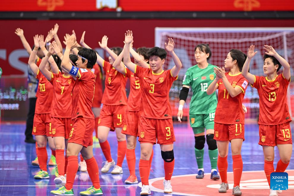 Team China wave to spectators after the quarterfinal match between China and Indonesia at AFC Women's Futsal Asian Cup 2025 in Hohhot, north China's Inner Mongolia Autonomous Region, May 13, 2025. (Xinhua/Bei He)