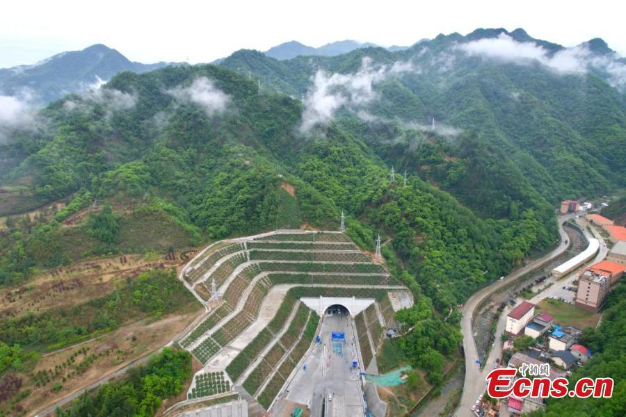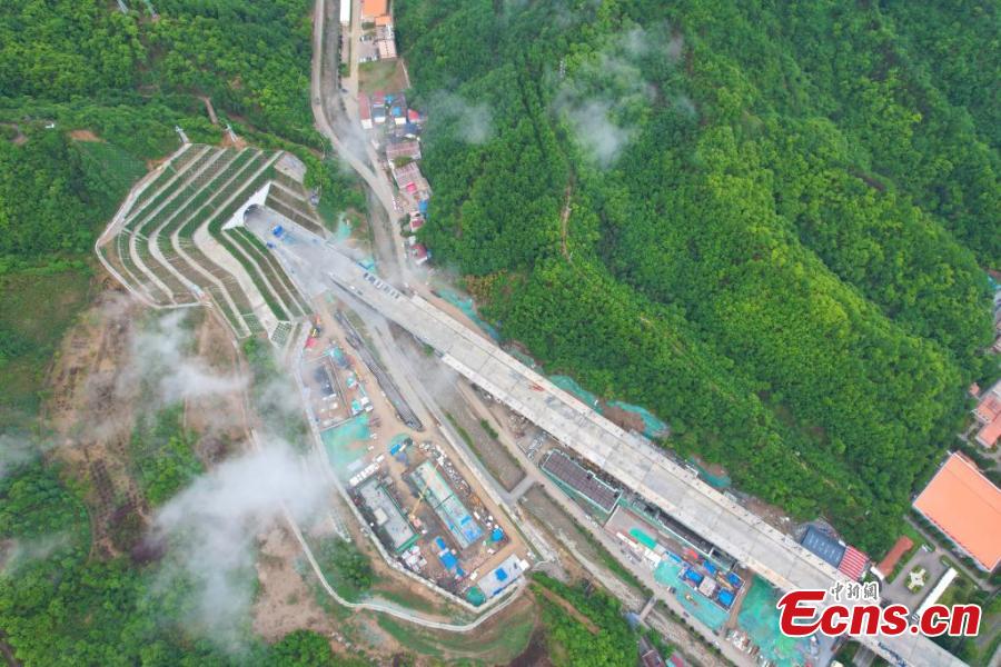 Aerial view of the construction site of the Jiutianshan Mountain tunnel along the Xi'an - Ankang railway line in northwest China's Shaanxi Province, May 13, 2025. (China News Service/Zhang Yuan)