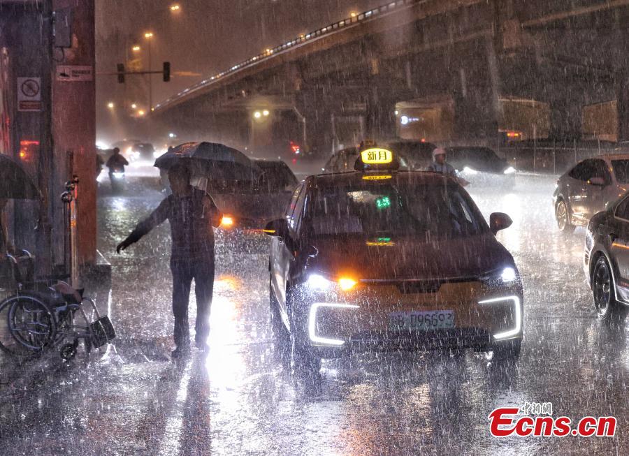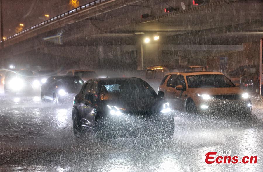 Cars run on a street amid thunderstorms and massive hail in Beijing, May 13, 2025. (China News Service/Sheng Jiapeng)