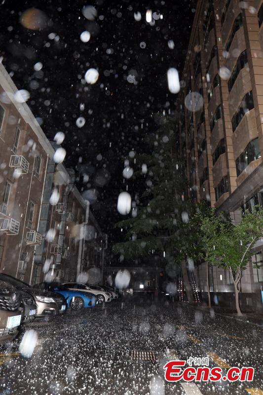 Photo shows the hailstones in Xicheng District, Beijing, May 13, 2025. (China News Service/Sheng Jiapeng)
