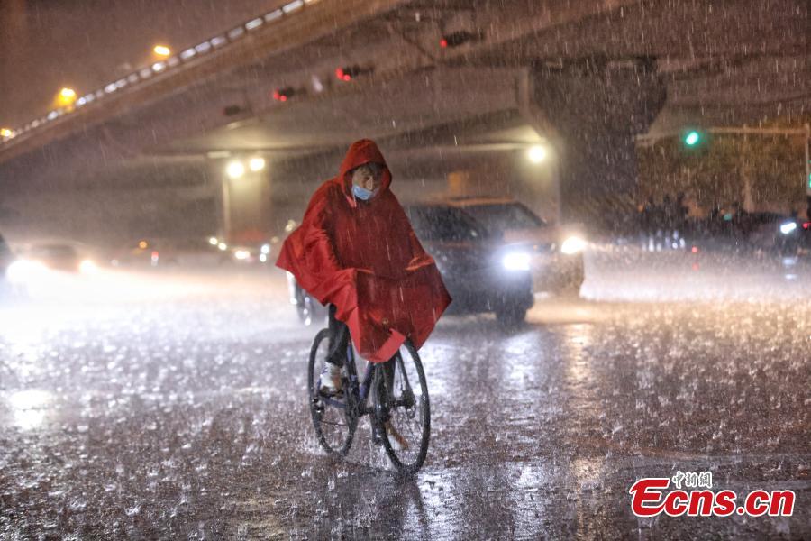 A man rides a bicycle amid heavy winds and thunderstorms in Beijing, May 13, 2025. (China News Service/Sheng Jiapeng)