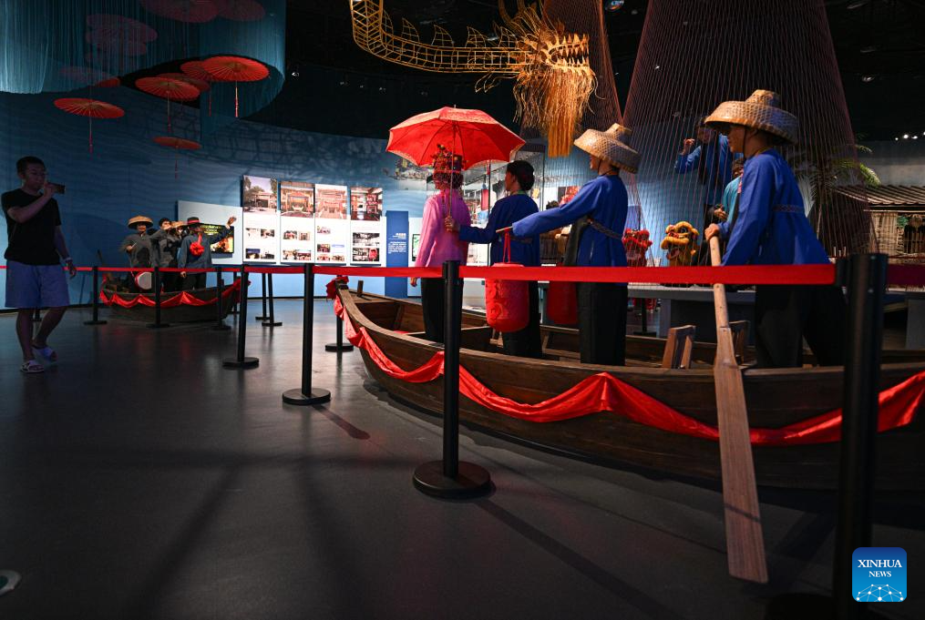 This photo taken on May 13, 2025 shows the scene of the Tanka people holding a wedding on water at Hainan Tanka Museum in Lingshui, south China's Hainan Province. (Xinhua/Pu Xiaoxu)