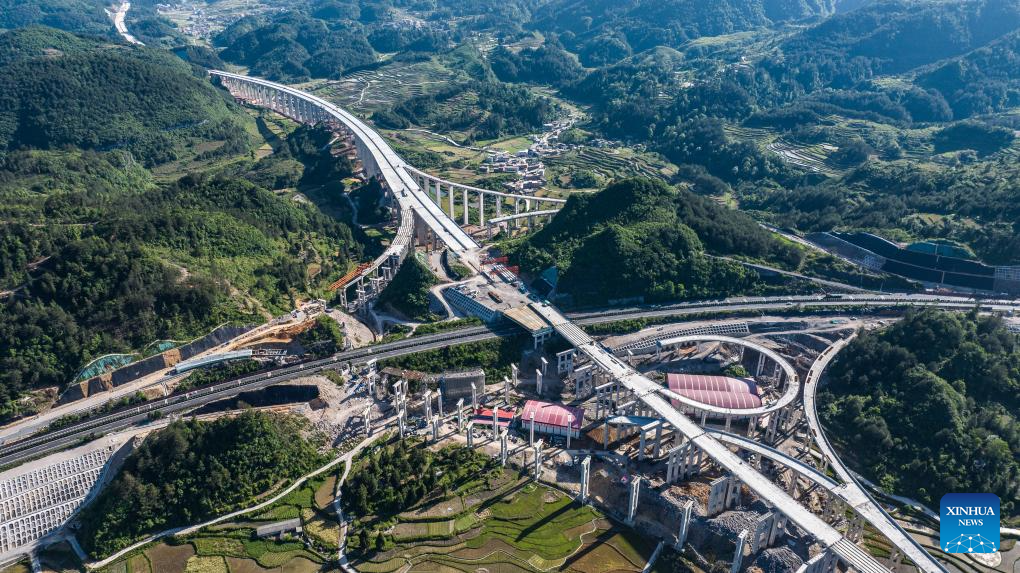 An aerial drone photo taken on May 12, 2025 shows the construction site of an elevated bridge hub along the Guiyang-Pingtang expressway in southwest China's Guizhou Province. With a designed speed of 100 km per hour, the Guiyang-Pingtang expressway in Guizhou has a total length of 174.018 km. According to the current progress of the project, the construction of the expressway is expected to be completed by the end of this year. (Xinhua/Tao Liang)