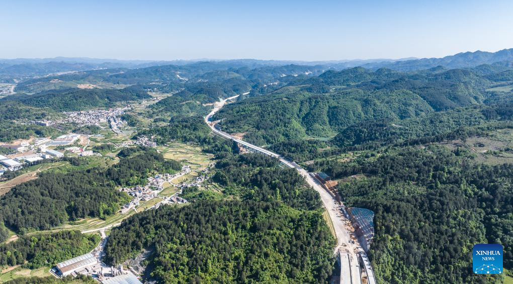 An aerial drone photo taken on May 12, 2025 shows a section of the Guiyang-Pingtang expressway under construction in southwest China's Guizhou Province. With a designed speed of 100 km per hour, the Guiyang-Pingtang expressway in Guizhou has a total length of 174.018 km. According to the current progress of the project, the construction of the expressway is expected to be completed by the end of this year. (Xinhua/Tao Liang)