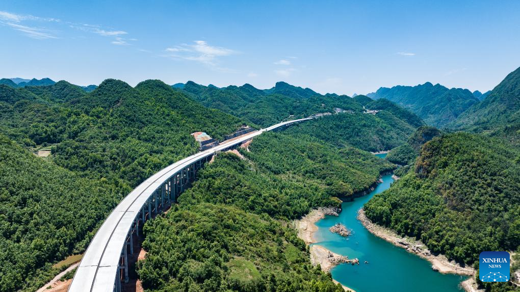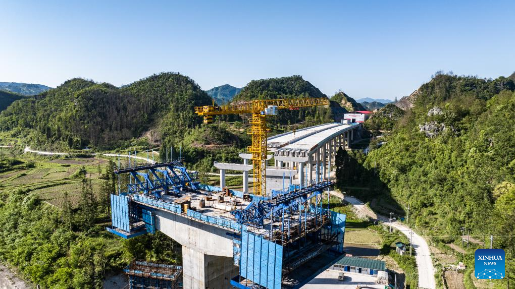 An aerial drone photo taken on May 13, 2025 shows the Lami River bridge along the Guiyang-Pingtang expressway under construction in southwest China's Guizhou Province. With a designed speed of 100 km per hour, the Guiyang-Pingtang expressway in Guizhou has a total length of 174.018 km. According to the current progress of the project, the construction of the expressway is expected to be completed by the end of this year. (Xinhua/Tao Liang)