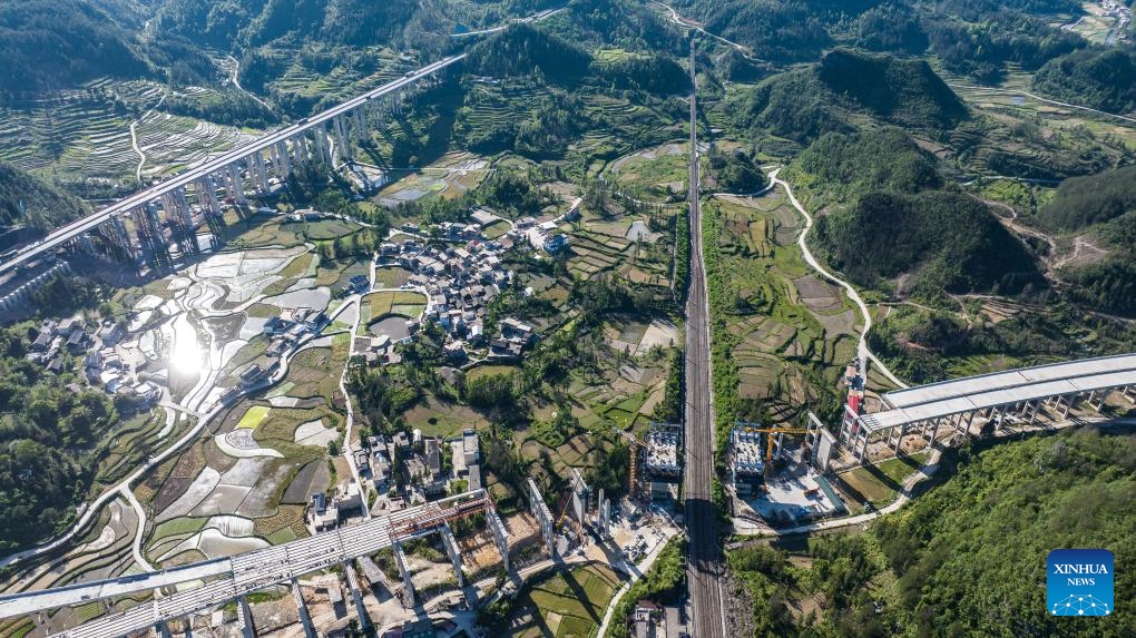 An aerial drone photo taken on May 12, 2025 shows the construction site of a bridge (R, bottom) along the Guiyang-Pingtang expressway in southwest China's Guizhou Province. With a designed speed of 100 km per hour, the Guiyang-Pingtang expressway in Guizhou has a total length of 174.018 km. According to the current progress of the project, the construction of the expressway is expected to be completed by the end of this year. (Xinhua/Tao Liang)