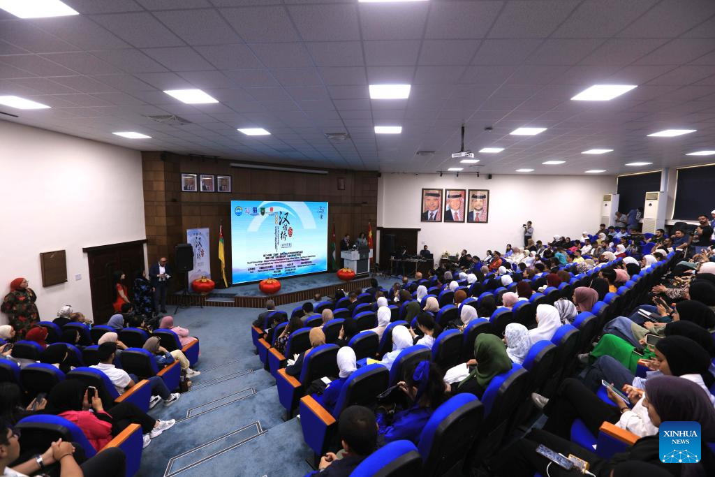 The final of the 24th edition of the "Chinese Bridge" Chinese Proficiency Competition for Foreign College Students in Jordan is held in Amman, Jordan, on May 14, 2025. The 24th edition of the "Chinese Bridge" Chinese Proficiency Competition for Foreign College Students in Jordan selected the country's champion on Wednesday to represent the country at the global finals, to be held in Beijing later this year. (Photo by Mohammad Abu Ghosh/Xinhua)