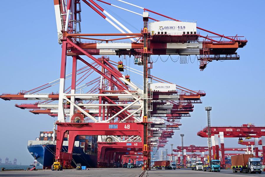 This photo taken on April 30, 2025 shows a container dock of Qingdao Port in Qingdao, east China's Shandong Province. (Xinhua/Li Ziheng)