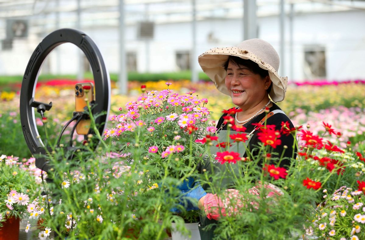 A grower hosts livestreaming sales of her flowers at a planting base in Qingdao, Shandong province. (Liang Xiaopeng/Xinhua)