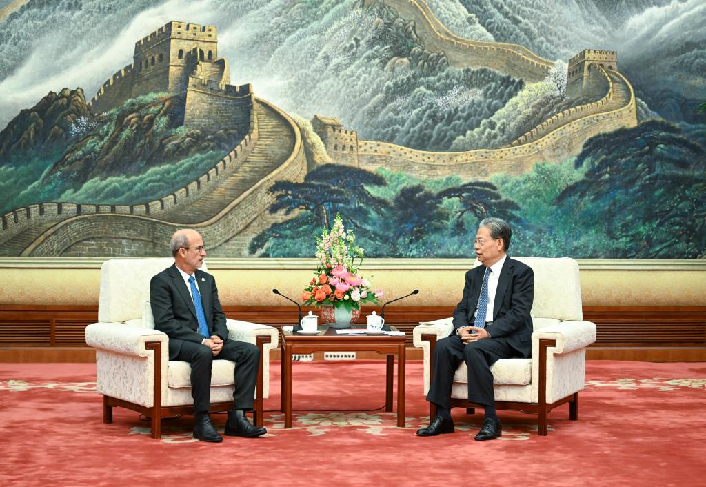 Zhao Leji, chairman of the National People's Congress Standing Committee, meets with Rolando Miguel Gonzalez Patricio, president of the Latin American and Caribbean Parliament (Parlatino), in Beijing, capital of China, May 14, 2025. (Xinhua/Zhang Ling)