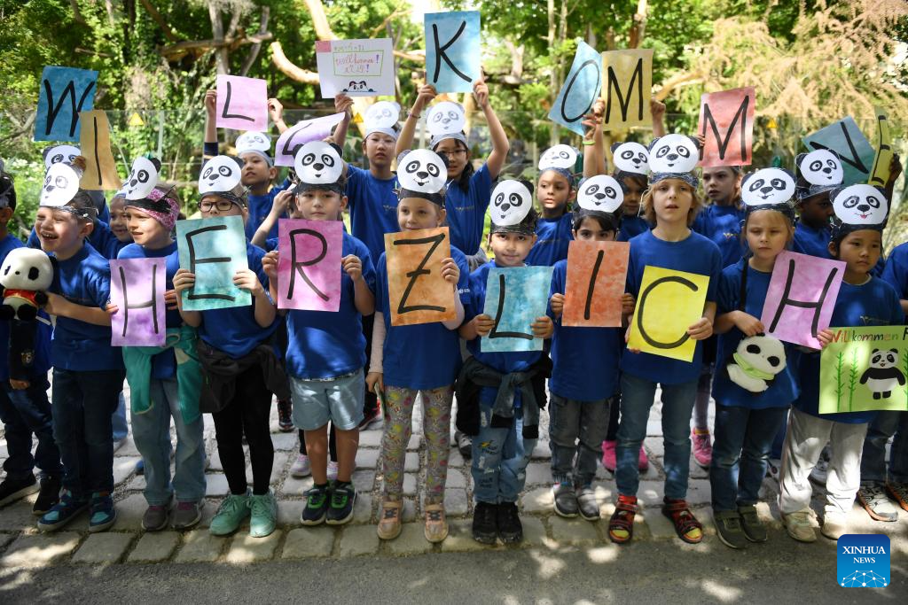 Children welcome a giant panda pair from China at Schoenbrunn Zoo in Vienna, Austria, May 14, 2025. (Xinhua/He Canling)
