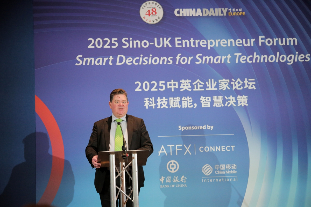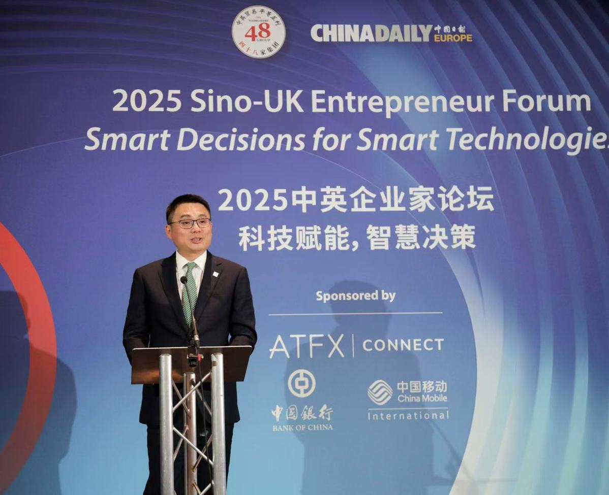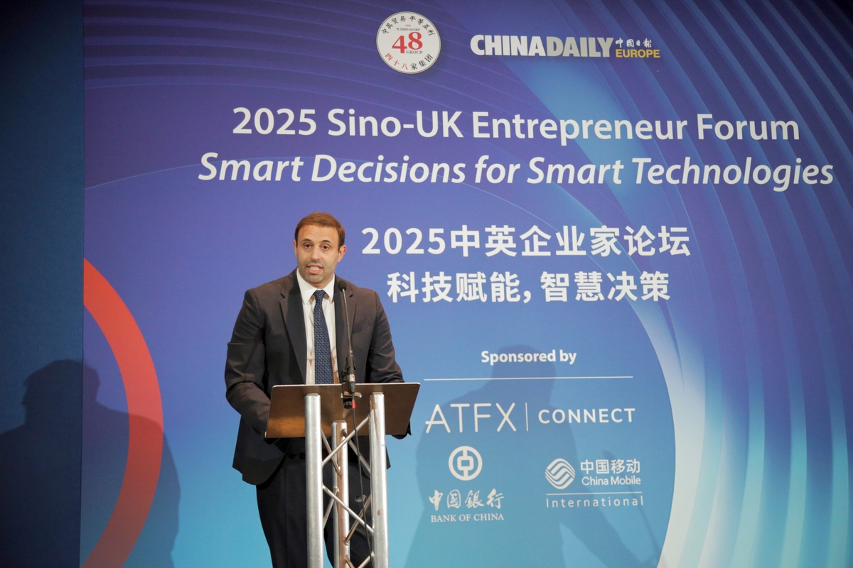 Zhang Weiqiang, CEO of ATFX Connect Global, makes a speech at the 2025 Sino-UK Entrepreneurs Forum in London on Wednesday. (Xing Yi/China Daily)