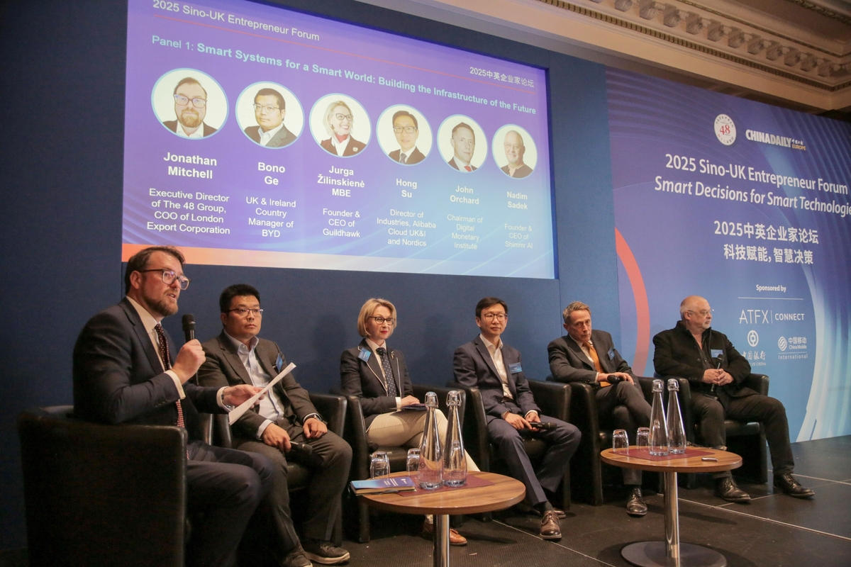 Experts and entrepreneurs discuss smart technologies in real life situations during a panel discussion at the 2025 Sino-UK Entrepreneurs Forum in London on Wednesday. (Xing Yi/China Daily)