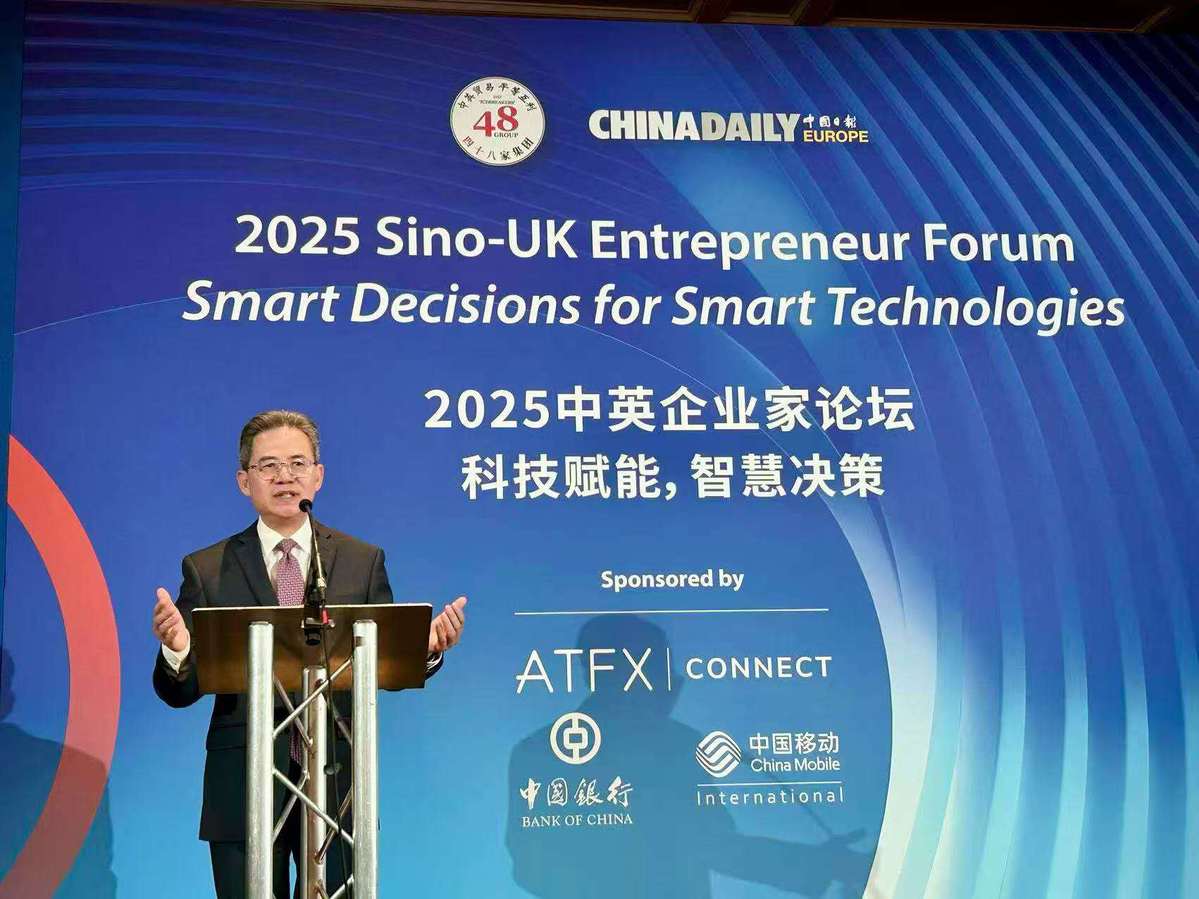 Zheng Zeguang, China's ambassador to the UK, delivers a keynote speech at the 2025 Sino-UK Entrepreneurs Forum in London on Wednesday. (Yang Chunya/China Daily)