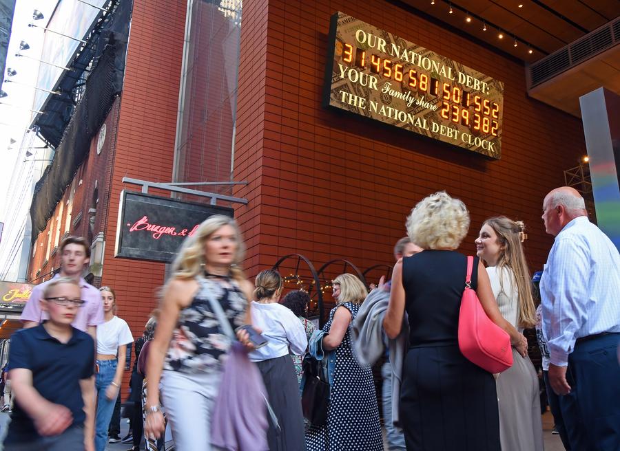 Pedestrians walk past the National Debt Clock in New York, the United States, on June 1, 2023. (Xinhua/Li Rui)