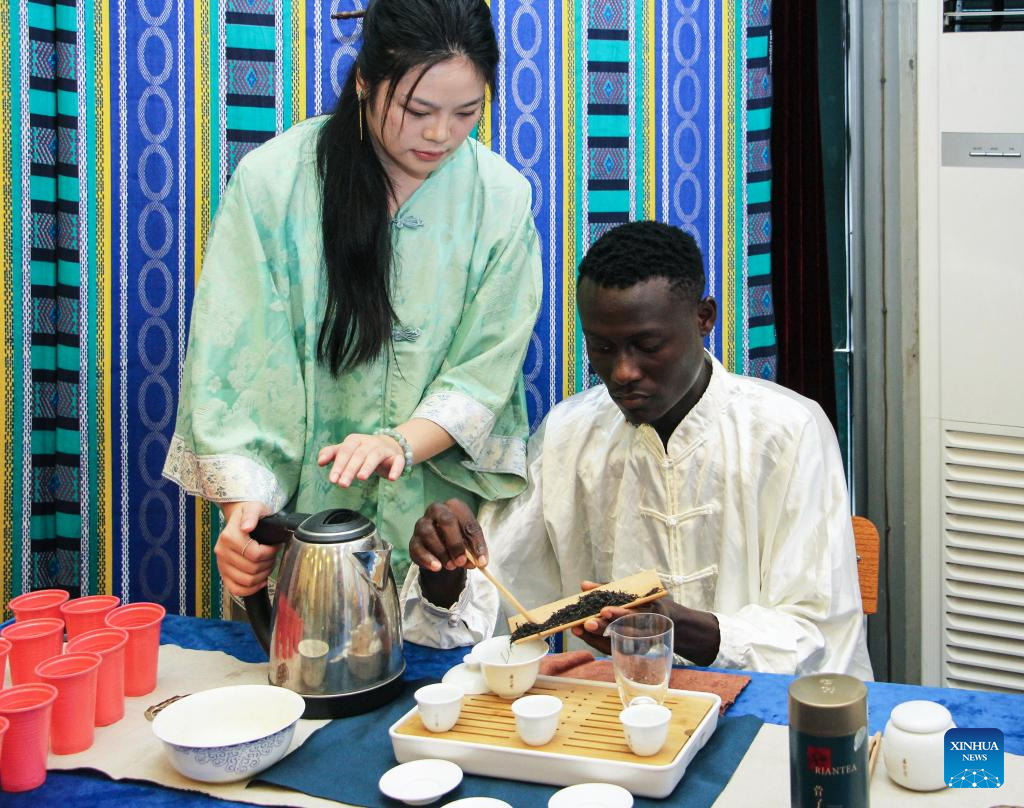 A student from the Confucius Institute demonstrates Chinese tea art at the Chinese Cultural Center in Cotonou, Benin, May 15, 2025.(Photo by Seraphin Zounyekpe/Xinhua)