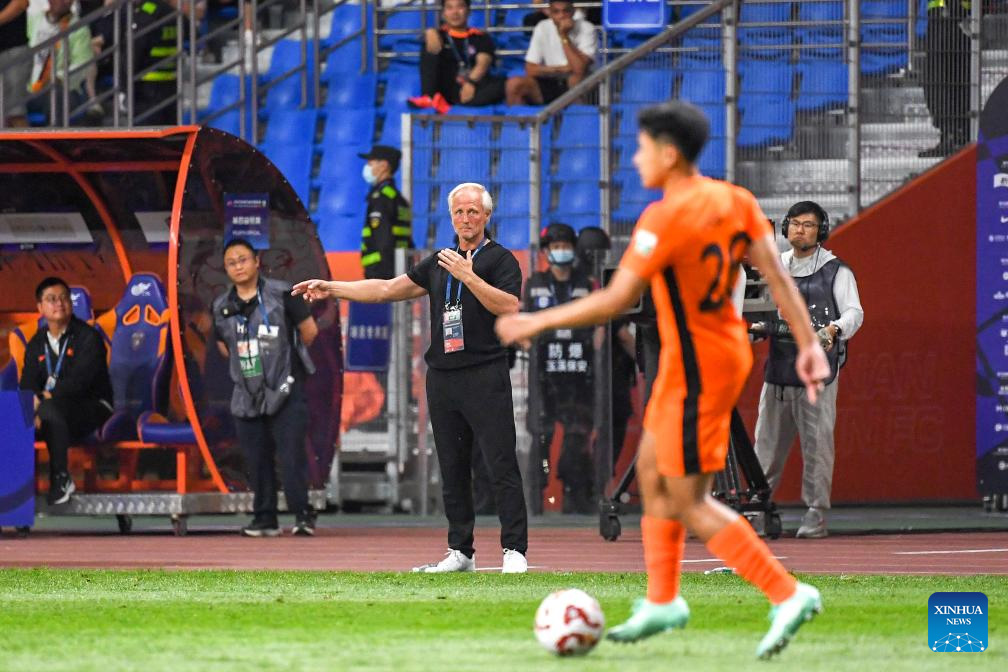 Jorn Andersen (C), head coach of Yunnan Yukun, instructs during the 13th round match between Yunnan Yukun and Meizhou Hakka at the 2025 season Chinese Football Super League (CSL) in Yuxi, southwest China's Yunnan Province, May 16, 2025. (Photo by Peng Yikai/Xinhua)