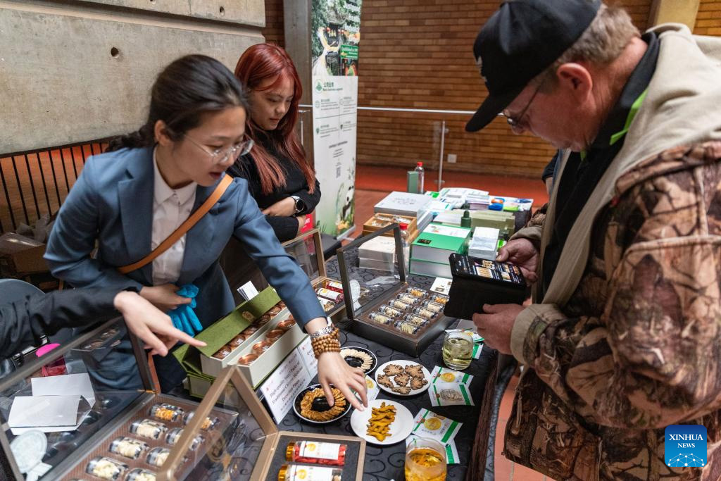 A visitor looks at Traditional Chinese Medicine (TCM) products during the 2025 Sichuan TCM Cultural Exchange Tour in Johannesburg, South Africa, on May 16, 2025. (Xinhua/Zhang Yudong)