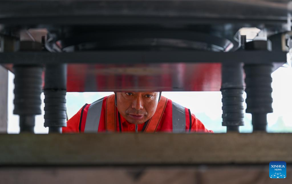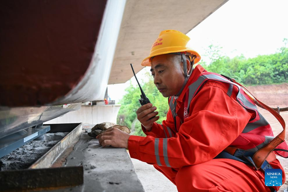 A staff member watches over the installation of the first box girder of Dazu section of the middle line of Chengdu-Chongqing railway at the construction site in Dazu District of southwest China's Chongqing Municipality, May 16, 2025. The first box girder weighting 697 tonnes at a length of 32.6 meters was accurately set up on Friday.