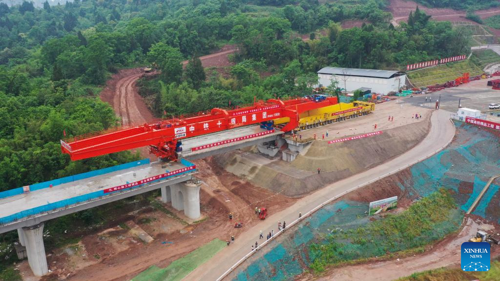 An aerial drone photo taken on May 16, 2025 shows a scene during the installation of the first box girder in a super major bridge of Dazu section of the middle line of Chengdu-Chongqing railway in southwest China's Chongqing Municipality. The first box girder weighting 697 tonnes at a length of 32.6 meters was accurately set up on Friday.