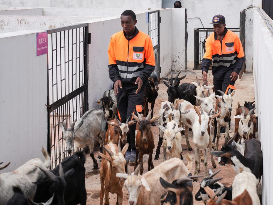 Staff members guide a herd of goats to the weighing area in Analamanga, Madagascar, on March 27, 2025. (Xinhua/Li Yahui)