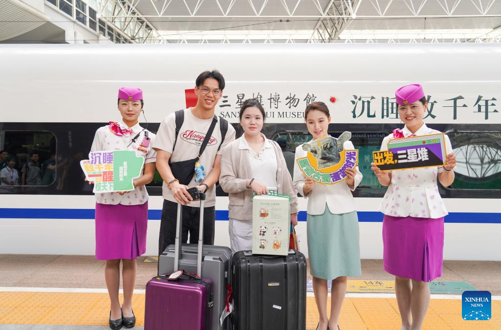 Passengers pose for a photo on a Sanxingdui-themed train linking Chengdu, Sanxingdui Ruins and Jiuzhai Valley in southwest China's Sichuan Province, May 18, 2025. The tourist train left Chengdu on Sunday, marking the launch of the first train themed around the legendary Sanxingdui Ruins site.