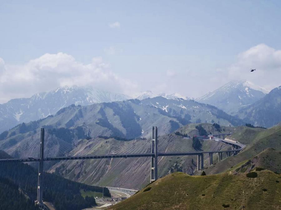 URUMQI, May 18 (Xinhua) -- I felt a gentle tremble as I climbed onto the viewing platform, partly because I was underdressed and partly due to the awe-inspiring view. From the distant snow-capped peaks to the green canyon below, and the majestic Guozigou Bridge in between, the breathtaking mountain scenery stretched as far as the eye could see.