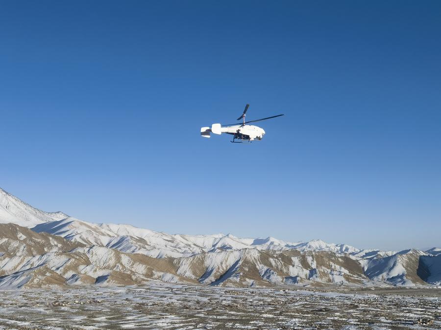 This file photo taken in October 2022 shows a TD550 coaxial unmanned helicopter in a trial flight on the plateau in Hetian, northwest China's Xinjiang Uygur Autonomous Region. (Photo/Xinhua)