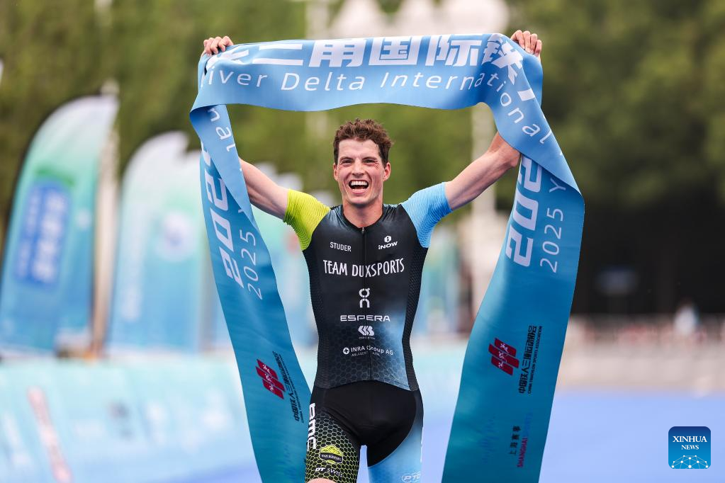 Max Studer of Switzerland celebrates after the men's elite division of 2025 Yangtze River Delta International Triathlon in Shanghai, east China, May 18, 2025. (Xinhua)