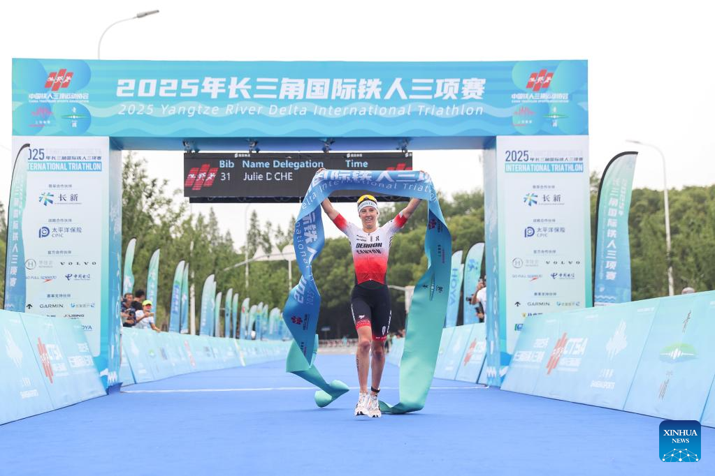 Julie Derron of Switzerland celebrates after the women's elite division of 2025 Yangtze River Delta International Triathlon in Shanghai, east China, May 18, 2025. (Xinhua)