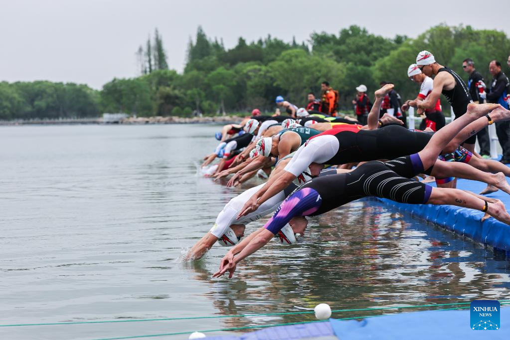 Participants compete during the 2025 Yangtze River Delta International Triathlon in Shanghai, east China, May 18, 2025. (Xinhua)