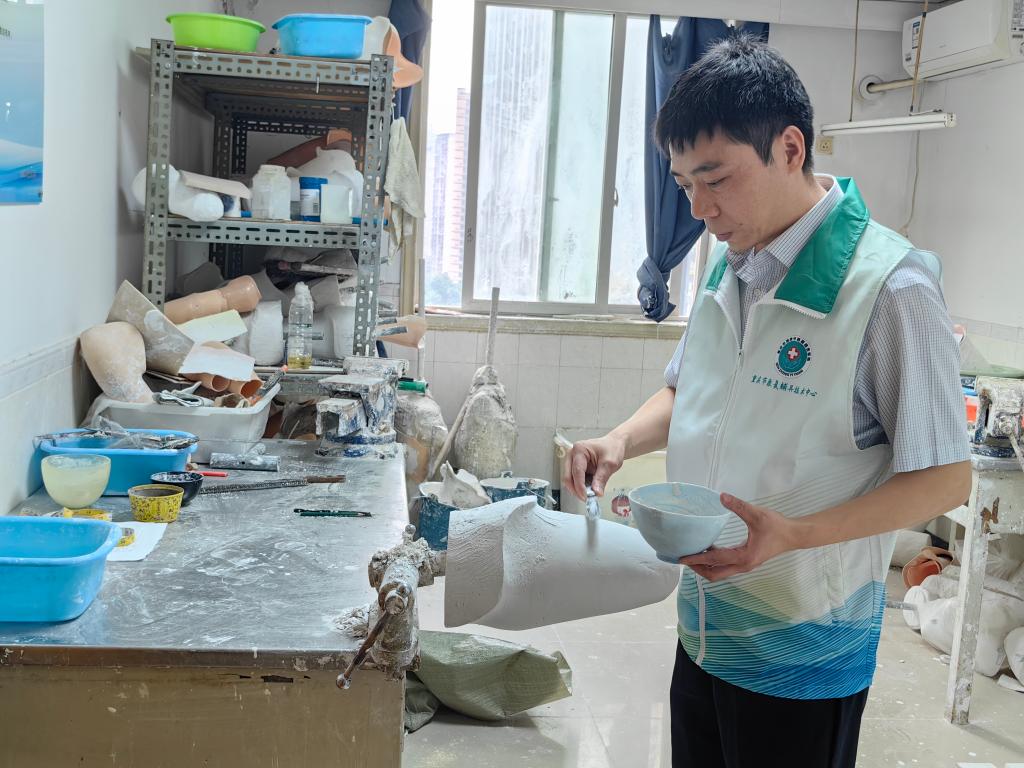 Zhang Wei, head of the department of assistive rehabilitation devices at the Chongqing Civil Affairs Hospital of Integrated Traditional Chinese and Western Medicine, shapes a mold for a prosthetic limb at the hospital in southwest China's Chongqing Municipality, May 16, 2025. (Xinhua/Wu Mengtong)