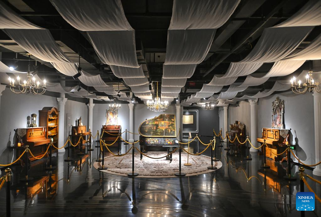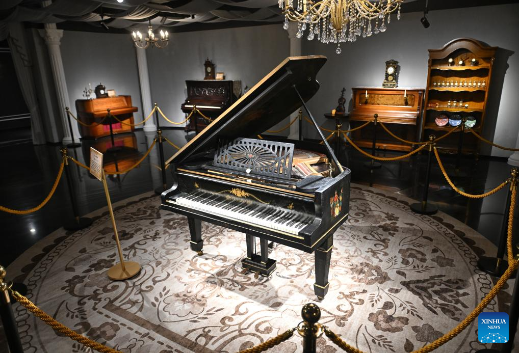 This photo taken on May 8, 2025 shows an antique piano displayed at the Chengdu Xin Smart Music Museum in Chengdu, southwest China's Sichuan Province. Chengdu Xin Smart Music Museum, home to a collection of over 300 instruments from all over the world, is designed to enable an immersive experience for visitors. With technologies such as 3D imaging, holographic theatres, and digital scene restoration, it reflects virtual historical scenarios, tells stories behind music works, and sheds light on technology innovations in those instruments. The museum has received about 50,000 visitors in since it opened on April 30, 2024. (Xinhua/Liu Kun)