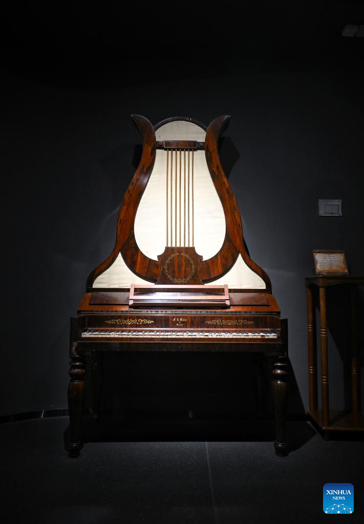 This photo taken on May 11, 2025 shows a German harp piano from mid 19th century displayed at the Chengdu Xin Smart Music Museum in Chengdu, southwest China's Sichuan Province. Chengdu Xin Smart Music Museum, home to a collection of over 300 instruments from all over the world, is designed to enable an immersive experience for visitors. With technologies such as 3D imaging, holographic theatres, and digital scene restoration, it reflects virtual historical scenarios, tells stories behind music works, and sheds light on technology innovations in those instruments. The museum has received about 50,000 visitors in since it opened on April 30, 2024. (Xinhua/Liu Kun)