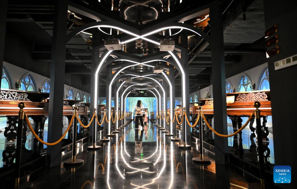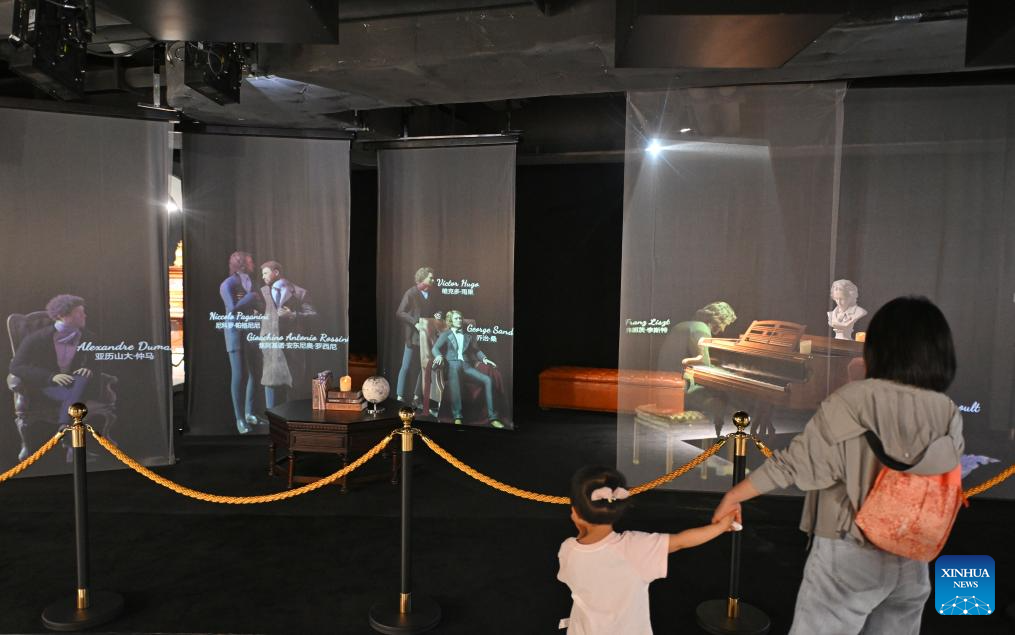 People visit the Chengdu Xin Smart Music Museum in Chengdu, southwest China's Sichuan Province, May 11, 2025. Chengdu Xin Smart Music Museum, home to a collection of over 300 instruments from all over the world, is designed to enable an immersive experience for visitors. With technologies such as 3D imaging, holographic theatres, and digital scene restoration, it reflects virtual historical scenarios, tells stories behind music works, and sheds light on technology innovations in those instruments. The museum has received about 50,000 visitors in since it opened on April 30, 2024. (Xinhua/Liu Kun)