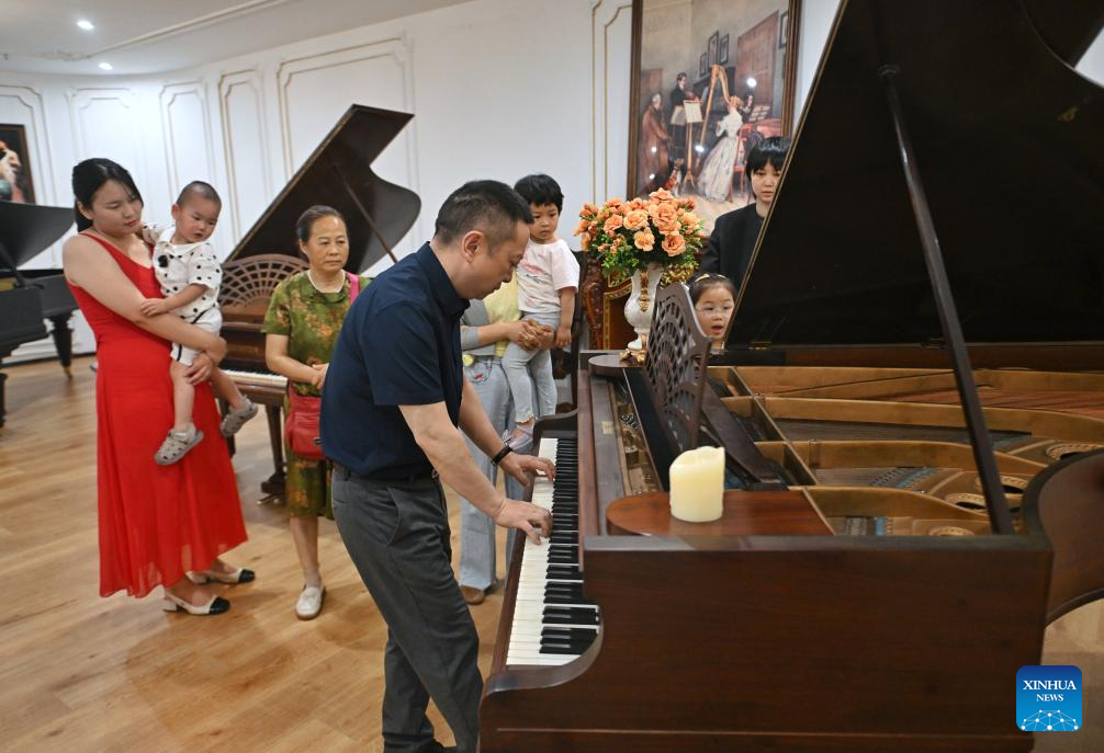 This photo taken on May 11, 2025 shows Ye Hao (C), curator of the Chengdu Xin Smart Music Museum, playing an antique German piano for visitors at his museum in Chengdu, southwest China's Sichuan Province. Chengdu Xin Smart Music Museum, home to a collection of over 300 instruments from all over the world, is designed to enable an immersive experience for visitors. With technologies such as 3D imaging, holographic theatres, and digital scene restoration, it reflects virtual historical scenarios, tells stories behind music works, and sheds light on technology innovations in those instruments. The museum has received about 50,000 visitors in since it opened on April 30, 2024. (Xinhua/Liu Kun)