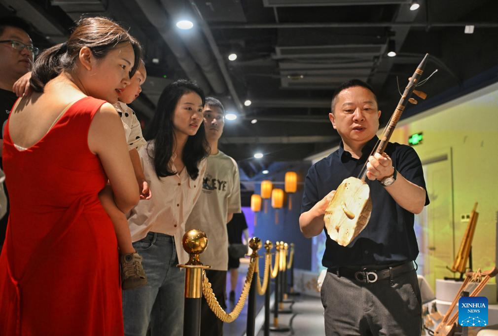 This photo taken on May 11, 2025 shows Ye Hao (1st R), curator of the Chengdu Xin Smart Music Museum, explaining an African instrument to visitors at his museum in Chengdu, southwest China's Sichuan Province. Chengdu Xin Smart Music Museum, home to a collection of over 300 instruments from all over the world, is designed to enable an immersive experience for visitors. With technologies such as 3D imaging, holographic theatres, and digital scene restoration, it reflects virtual historical scenarios, tells stories behind music works, and sheds light on technology innovations in those instruments. The museum has received about 50,000 visitors in since it opened on April 30, 2024. (Xinhua/Liu Kun)